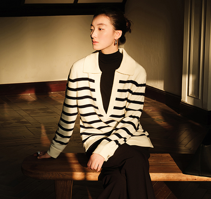 谭飞重视每一款产品的体感,成衣生产完成后,经过穿十洗十,确认体感舒适、品质无瑕疵才量产。以羊绒、羊毛、真丝、三醋酸、埃及棉、进口四面弹、土耳其牛仔等进口面料为主。加上具原创设计感的图案,把细节演化成时尚的语言,展现一种时尚且不失优雅的女性化风格。